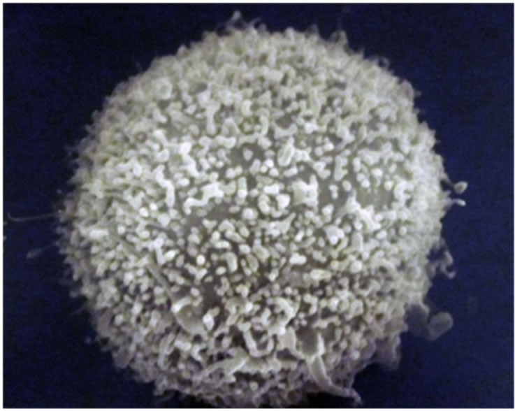 (b) Figure 5. SEM normal villous surface of the P815 cancer cell (Figure 5(a)) and the killing of the P815 cancer cell by the injection of the NKC toxin with resulting “blebbing” of the cancer cell membrane (Figure 5(b)).
