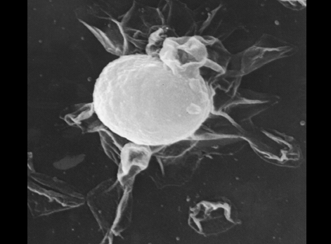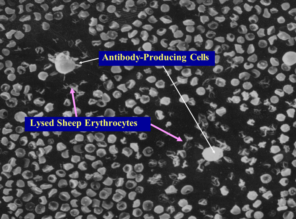 Figure 2. Natural Killer Cell (CIPFC) completely destroy-ing the surrounding SRBC. Copyright 1974 the American Association of Immunologists, Inc.