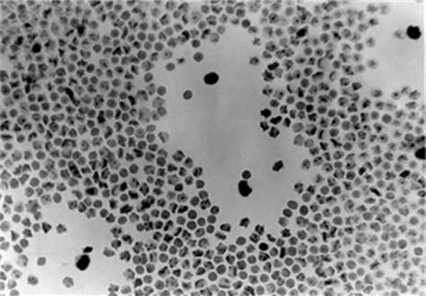 Since a SRBC monolayer was being produced on the microscope slide surface, immune cellular interactions could be seen with great accuracy. One of the unusual plaques that were being formed in these immunized mice is shown in Figure 2 where lysed SRBC were not seen in the plaques. In fact, the plaques appeared “clear” by SEM (Figure 2) and light microscopy (Figure 3), where the central cell was releasing a lytic agent that com-pletely destroyed the surrounding SRBCs in a radial fashion [4-6,9-11]. These clear plaques were seen re-gardless if complement was present or not, thus receiving