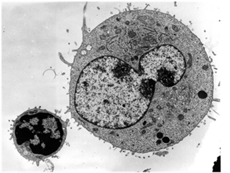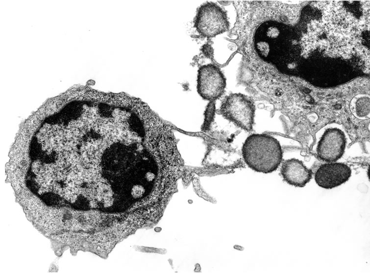 (b) Figure 6. TEM sequence of events showing a presumptive NKC approaching the cancer cell (Figure 6(a)) and the killing of the cancer cell by the injection of the toxin with resulting “blebbing” of the cancer cell membrane (Figure 6(b)).