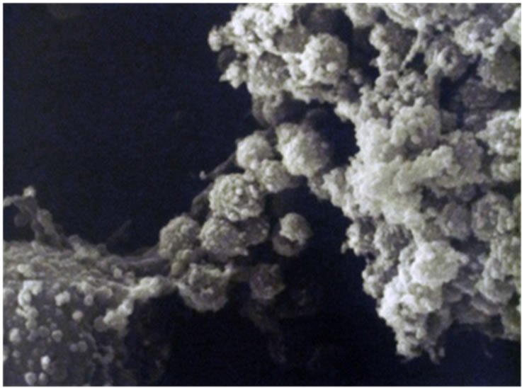 While conducting thesis research under Dr. Robert Leif from Florida State University in late 1971 at the Papani-colaou Cancer Research Institute in Miami, Dr. Thorn-thwaite’s thesis project was to transform the Agar-based Jerne Plaque Assay into a non-agar setting. This immu-nological technique was used to detect murine B cells producing IgM against Sheep Red Blood Cells (SRBC), which were derived from the spleens of mice immunized four days earlier with SRBC. This method, termed the Plaque Cytogram Assay (PCA) [4] is able to create cell monolayers on microscope slides through centrifugation in a centrifuge bucket designed to form a glass slide bot-tom, whereby monolayers of cells distribute themselves onto a slide surface by centrifugation. This technique also enabled the carefully extraction of supernatants, while subsequently being able to carefully layer solutions such as guinea pig complement and Glutaraldehyde without disturbing the cell monolayer. After the cells were fixed to the slides, the samples could be processed for Light, Scanning Electron Microscopy (SEM) and Transmission Electronic Microscopy (TEM) [5-8] as presented below. Figure 1 shows by SEM two antibody secreting B-cells forming plaques formed due to the ra-dial release of IgM antibodies in thepresence of guinea pig complement (30 min at 37˚C) are shown.