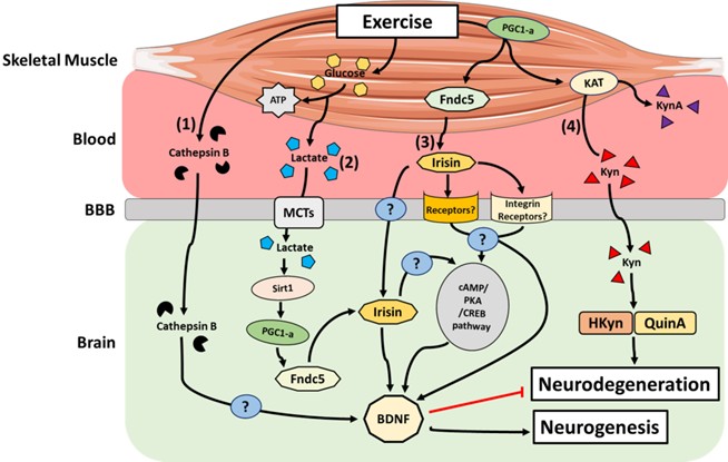 Figure 2. Main mechanisms by which active skeletal muscle can impact the brain. (1) Cathepsin B transcription is upregulated in brain and skeletal muscle, and its concentration increases in the blood in response to exercise. Cathepsin B is able to cross the BBB and may induce BDNF transcription in hippocampal neurons