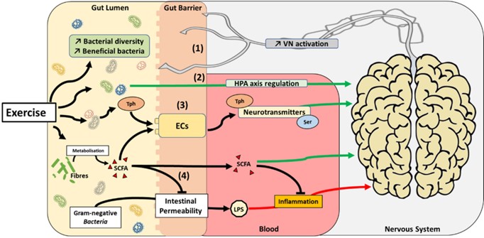 Figure 3. Proposed mechanisms by which exercise can impact the gut microbiota–brain axis. Exercise promotes the development of beneficial bacteria species and increase bacterial diversity in the gut. This phenomenon may have several impacts on the gut microbiota–brain axis: (1) activation of the vagus nerve (VN), (2) activation of the HPA axis, (3) modulation of neurotransmitter metabolism (i.e., tryptophane (Tph) and serotonin (Ser), and/or (4) reduction of inflammation by SCFA production