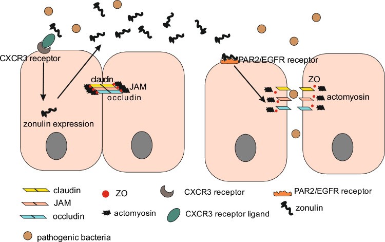 Mechanism of zonulin secretion. In the course of inflammation, CXCR3 receptors are activated, leading to the expression of zonulin protein in intestinal epithelial cells. Zonulin is secreted into the extracellular space and then activates PAR2/EGFR receptors, which triggers a biochemical cascade inside the cell and ultimately causes TJ relaxation