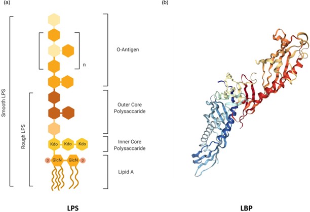 Figure 1. The structures of LPS and LBP. (a) Simplified structure of LPS from Gram-negative bacteria. The immunostimulatory lipid A is bound to a conserved inner core of sugars such as Kdo, which is bound in turn to a more variable outer core of common hexose sugars (eg glucose and galactose). The highly diverse O-antigen at the distal region of the LPS molecule is composed of repeated units of common hexose sugars. Rough-type LPS lacks an O-antigen. (b) Crystal structure of LBP (Protein Data Bank: 4M4D). The N-terminal portion is the main binding sites for lipid A, with the C-terminal involved in LPS transfer.