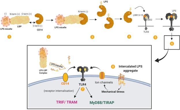 (3) LPS is transferred to CD14 in multiple rounds of transfer. (4) LPS is transferred from CD14 to MD2 by interacting with the LRR13–LRR15 domain of TLR4. (5) The receptor complex of TLR4–MD2 and LPS dimerises. (6) This results in signal activation by TLR4–MD2. (7) Signaling proceeds through MYD88-dependent and MYD88-independent pathways. (8) TLR4 cooperates with various co-receptors. LPS aggregates that have been intercalated into the plasma membrane by LBP may induce mechanical stress on transmembrane proteins and ion channels and contribute to LPS signaling. Adapted from.165