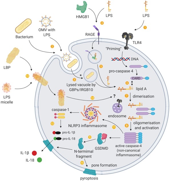 Figure 3. Intracellular sensing of LPS and the non-canonical inflammasome. (1) Binding of PAMPs such as LPS to extracellular pattern-recognition receptors activates signal transduction cascades that induce gene expression of the components required for non-canonical inflammasome activation, a process termed “priming”. (2) Extracellular Gram-negative bacteria or their outer membrane vesicles (OMVs) can deliver LPS into the cytoplasm of host cells through endocytosis. (3) Guanylate-binding proteins (GBP) together with IRGB10 disrupt vacuoles containing pathogens, which enables LPS to be released into the cytosol. (*) LPS from OMVs are released from early endosomes, which does not involve GBPs/IRGB10 mediated lysis. (4) HMGB1 promotes the internalisation of LPS into vacuoles through RAGE. (5) HMGB1 additionally permeabilises this vacuole to release LPS into the cytosol. Cytosolic LPS can be recognised by inflammatory caspases and to provide a “triggering” signal for activation of the non-canonical inflammasome pathway. (6) The lipid A tail of LPS binds to the CARD motif of pro-caspase 4 in a direct interaction. (7) These intracellular LPS–pro-caspase 4 complexes dimerise and (8) oligomerise through the CARD motif, and proximity-induced activation leads to a catalytically active conformation of the non-canonical inflammasome. (9) The activated non-canonical inflammasome cleaves gasdermin D (GSDMD), releasing the amino-terminal fragments, (10) which form pores at the cell membrane. (11) The non-canonical inflammasome also activates the NLRP3 canonical inflammasome through an unknown mechanism, (12) and this inflammasome pathway releases IL-1β and IL-18, which is secreted through GSDMD pores. (13) LPS can additionally be delivered into cells through cell-bound LBP. (14) Intracellular transport of LPS by LBP raises the possibility of a role for LBP in the delivery of LPS to intracellular LPS receptors such as endosomal TLR4 and inflammatory caspases.