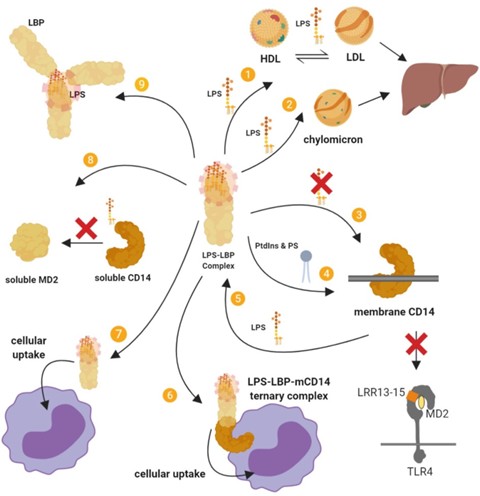 Additionally, LBP intercalated into LPS aggregates can mediate the crosslinking of several layers of lipid A, which has a neutralising effect by decreasing the accessibility of lipid A.70 This complexation increases the binding energy of the LPS in the complex as well as prevents LBP from inserting in the plasma membrane. LPS–LBP complexes in the plasma do not interact with membrane-bound LBP, which limits some of the stimulatory mechanisms of LPS.10