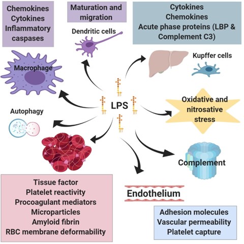 Figure 5. Summarised downstream effects of LPS signaling. LPS influences a range of cell types and physiological processes. The activation of leukocytes initiates the immune response and the release of various inflammatory mediators. LPS also activates specific immune processes such as the maturation and migration of dendritic cell, autophagy in macrophages, and activation of the complement system. In the liver, LPS stimulates the production of acute phase proteins as well as several inflammatory mediators. Similarly, LPS promotes inflammatory reactions in adipose tissue. These mediators as well as the increased activity of enzymes involved in the production of reactive oxygen and nitrogen species contribute to a cellular stress. A major action of LPS is its ability to promote coagulation both by enhancing the expression of molecules that stimulate clotting and through direct interaction with red blood cells and platelets. LPS-mediated changes to the endothelium also promote coagulation.