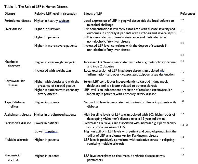The effects of LBP levels in disease are highlighted in Table 1. LBP is usually seen as a host-protective factor to manage the effects of LPS.73 It enables the immune system to respond efficiently to bacterial invasion but also exhibits a dual function by blunting these effects at high doses. However, the activity of LBP in enhancing LPS-mediated stimulation and cytokine release is also viewed as a contributor to the pathogenic state mediated by LPS. In mice, antibody-mediated depletion of LBP see-mingly protects against LPS-induced toxicity,74 possibly even attenuating the onset of disease (eg diet-induced non-alcoholic fatty liver disease in mice75) and dysfunction (eg endothelial dysfunction and tissue fibrosis in a swine model of LPS-induced acute kidney injury.76) Furthermore, certain LBP gene polymorphisms are associated with an increased risk of pathology. For example, a functional variant in the LBP promoter (SNP 1683) has greater promoter inducibility, which is associated with higher median basal serum levels of LBP and a 5-fold increase in Gram-negative bacteraemia-related mortality of patients after allogeneic hematopoietic cell transplantation.77 Acute-phase levels of LBP can also potentiate rather than inhibit overwhelming inflammatory responses following LPS challenge compared with LBP knockout mice in the setting of cholestatic liver disease.78