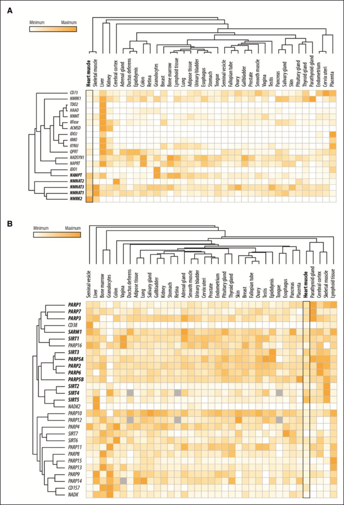 Figure 1. Gene expression levels of the enzymes involved in NAD+ metabolism. Shown are the relative gene expression levels of the enzymes involved in (A) the deamidated and amidated pathways of NAD+ biosynthesis as well as (B) those involved in NAD+ catabolism in the heart and other organs/tissues. The data were retrieved from The Human Protein Atlas (http://www.proteinatlas.org/) and subsequently subjected to hierarchical clustering in Morpheus (https://software.broadinstitute.org/morpheus). Data not available in the atlas are represented by gray boxes. NAD+ indicates nicotinamide adenine dinucleotide, oxidized form.