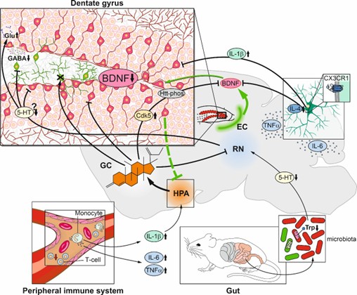 Figure 2. Schematic integrated view of mechanisms conferring negative regulation of adult hippocampal neurogenesis by chronic stress. Hypothalamic–pituitary–adrenal-(HPA) axis controls stress-induced glucocorticoid (GC) release, which exerts a direct negative effect on adult neural stem cells and their progeny (red cells) in the dentate gyrus. In reverse, adult-born neurons exert negative feedback on the HPA axis (green dashed line). HPA axis can get activated by increased interleukin-1β(IL-1β) released by peripheral monocytes. Under conditions of chronic stress, the gut microbiome can change to low tryptophan (Trp) metabolizing microbiota, mainly targeting the serotonergic system of the raphe nuclei (RN), leading to serotonin (5-HT) reduction. 5-HT-reduction might also be due to direct GC effects on raphe neurons, with control of hippocampal glutamatergic and GABAergic release in the dentate gyrus, leading to high glutamate (Glu) and reduced GABA levels. Low GABA is further caused by a GC-mediated decrease of hilar interneurons (green cells). In addition, reduced 5-HT and dysregulation of 5-HT receptors (5HT1AR and 5HT4R, not depicted) on mature granule cells (light red cells) leading to reduced BDNF availability might be implicated in the stress-induced reduction of neurogenesis. BDNF reduction is also central, due to other mechanisms: (1) Decreased axonal transport of BDNF vesicles from the entorhinal cortex (EC; green arrows for vesicular BDNF-transport), due to hyperphosphorylated huntingtin (Htt-phos) mediated by GC-induced cyclin-dependent kinase 5 (Cdk5); (2) decrease in interleukin-4 (IL-4) sensed by microglia. Moreover, microglia directly inhibit adult neural stem cells and their progeny, (1) through signaling activated by binding of the chemokine CX3CL1 to CX3CR1, which is exclusively expressed on microglia, and (2) by the secretion of IL-1β. Increased interleukin-6 (IL-6) and tumor necrosis factor-α (TNFα) make up the inflammatory milieu of the brain, but are not necessarily released by microglia.