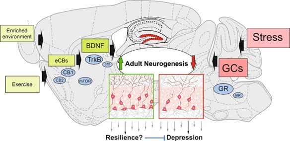 Figure 1. Schematic view of modulating factors of adult hippocampal neurogenesis. Enriched environment, exercise, and molecular players (e.g., endocannabinoids (eCBs) and brain-derived neurotrophic factor (BDNF)) have the potential to upregulate the generation of adult-born neurons in the dentate gyrus. This could confer resilience to the development of depressive-like symptoms through the stress-related decline of adult neurogenesis induced by glucocorticoids (GCs). The main signaling pathways of positive modulators and stress are depicted: cannabinoid receptor type-1 and -2 (CB1; CB2); mammalian target of rapamycin (mTOR); tropomyosin receptor kinase B (TrkB); p75 neurotrophin receptor (p75); glucocorticoid receptor (GR); mineralocorticoid receptor (MR).
